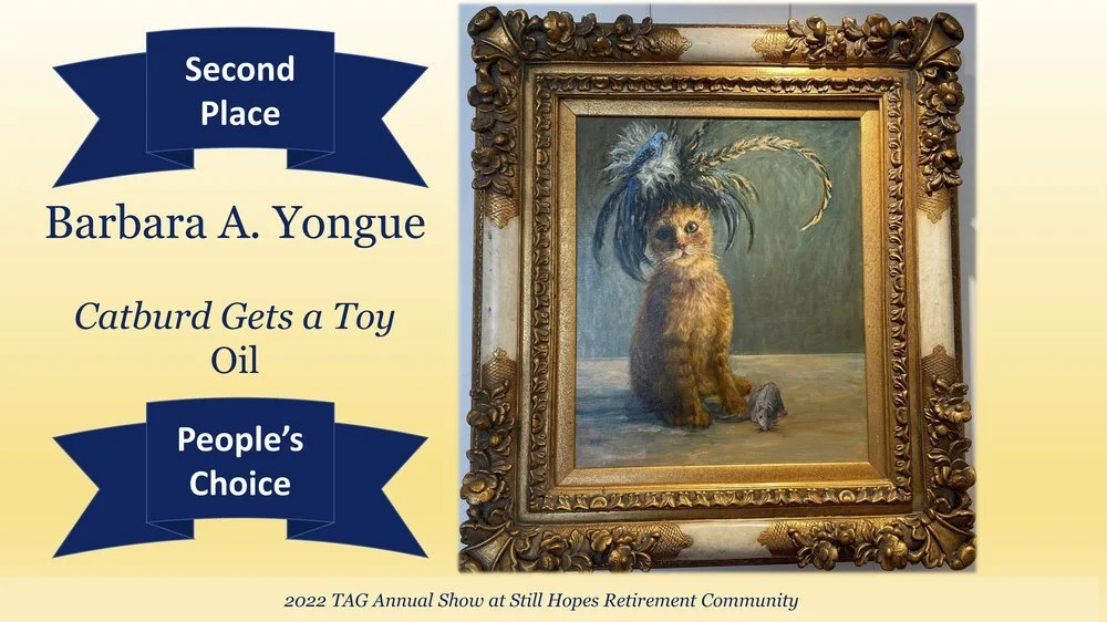A special thank you to the Still Hopes Art Committee (Dorothy, Shirley, Sue, Kitty) and the Still Hopes staff; TAG take-in and hanging volunteers; Co-chairs Renea Eshleman and Barbara Yongue; Sponsors of memorial awards: Sharon Funderburk, Renea Eshleman, Karen Jamrose, Joong Kim, David Phillips, Jeannie Branham; and Past Presidents Participants: David Phillips, Karen Jamrose, Renea Eshleman